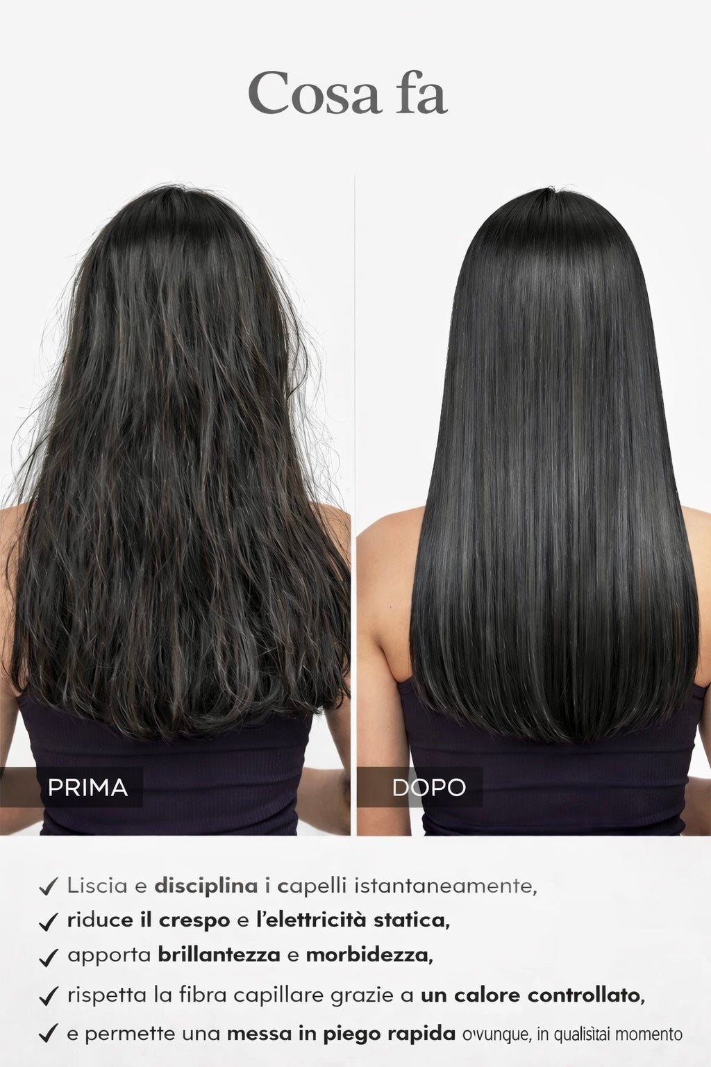 La sua tecnologia riscaldante avanzata liscia efficacemente i capelli, riduce il crespo e dona una brillantezza naturale fin dal primo passaggio.